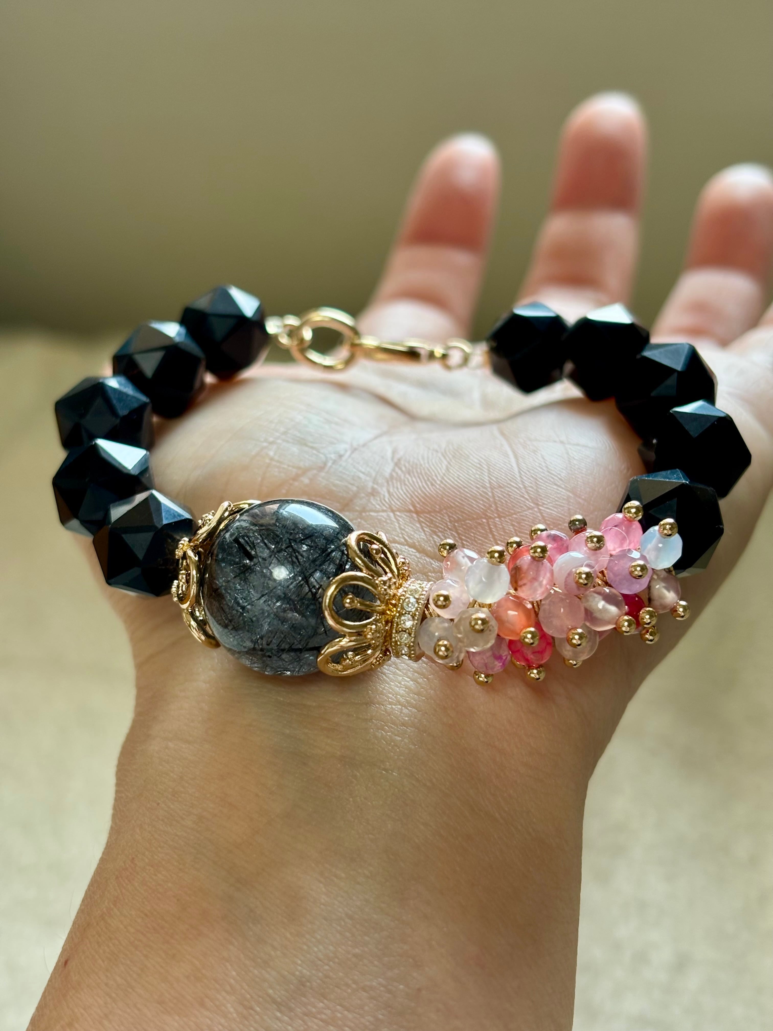 ブラックルチル(もしかするとブラックトルマリンかもしれません)とオニキスにピンクのジェードを入れる事で、少し可愛らしくしてみましたが、いかがでしょうか?