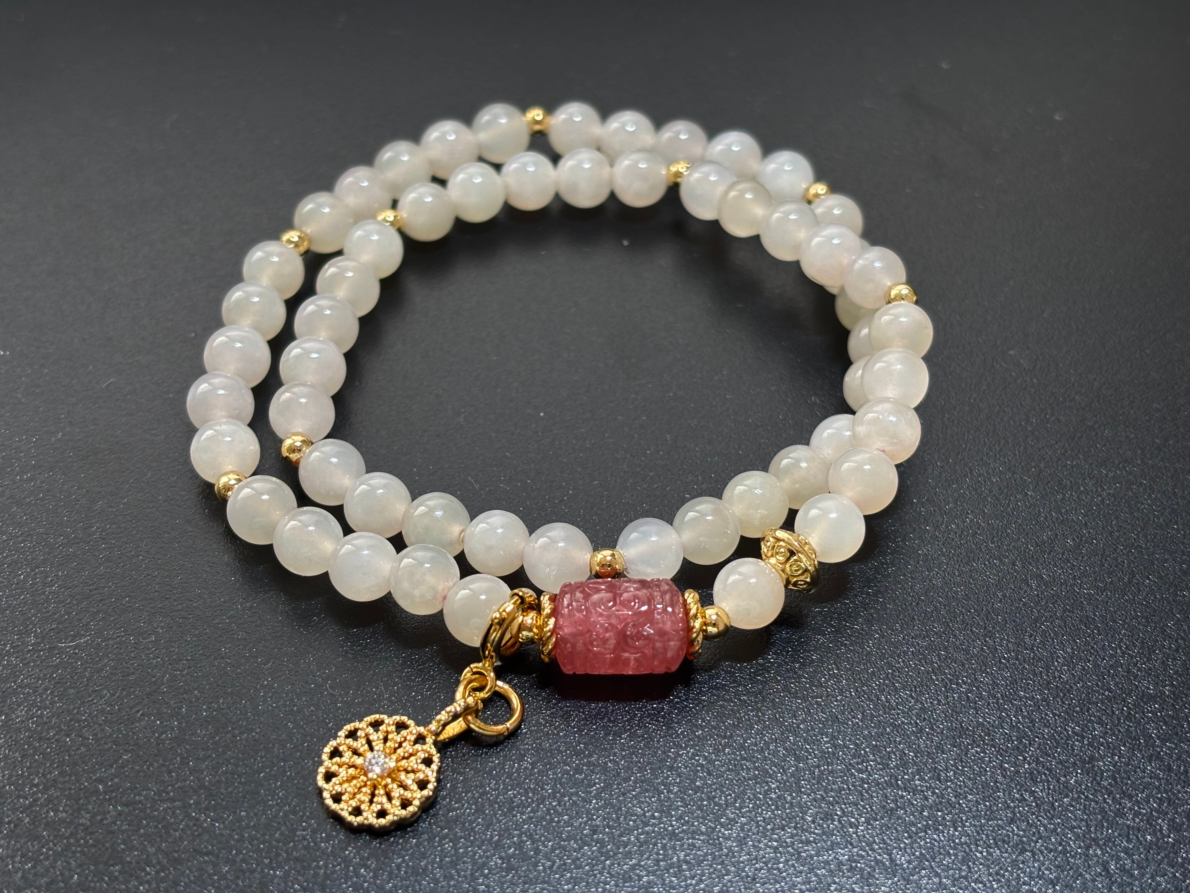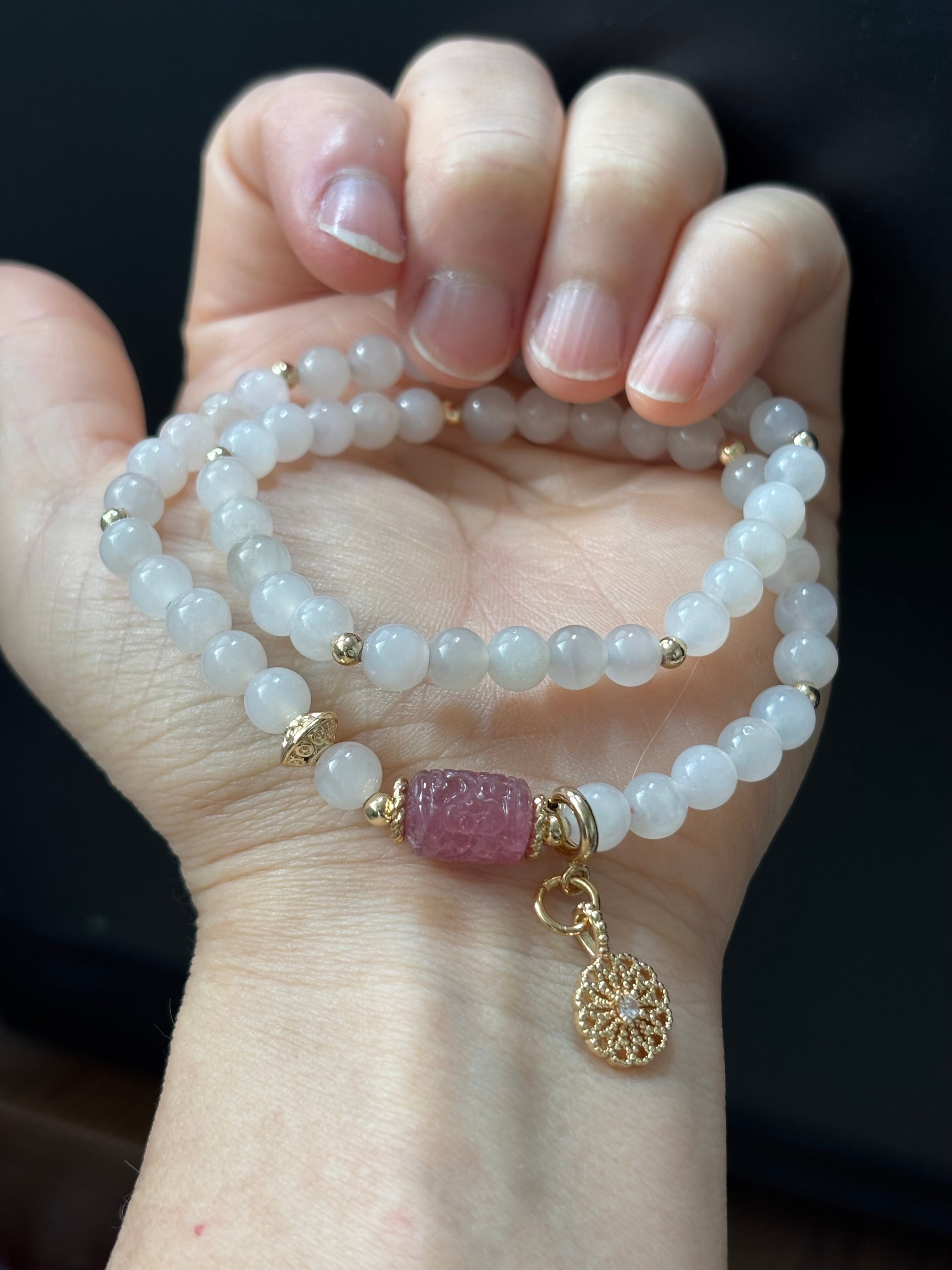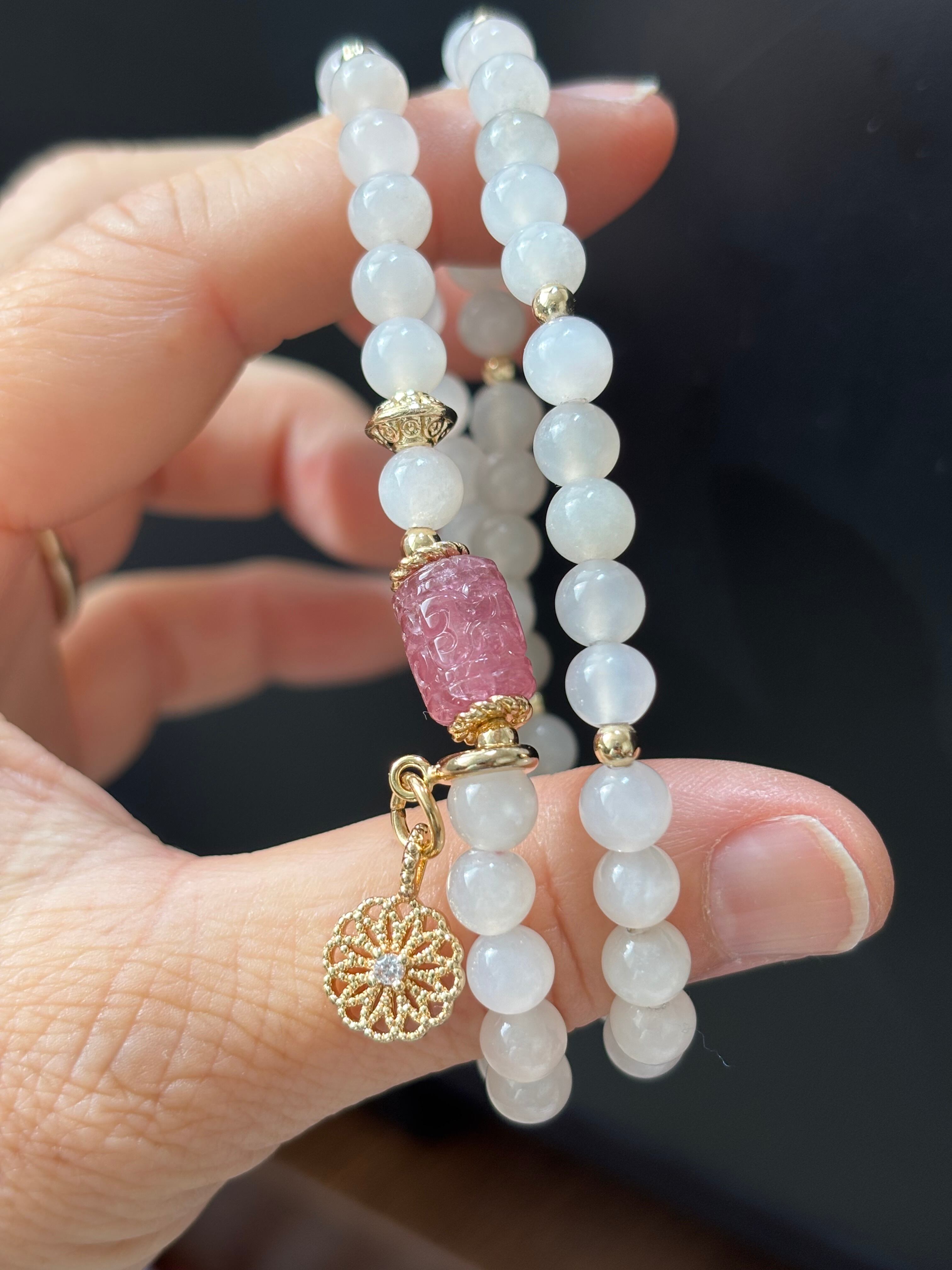 高品質ミャンマー産ピンク翡翠に、ピンクトルマリンの回文珠を合わせました。