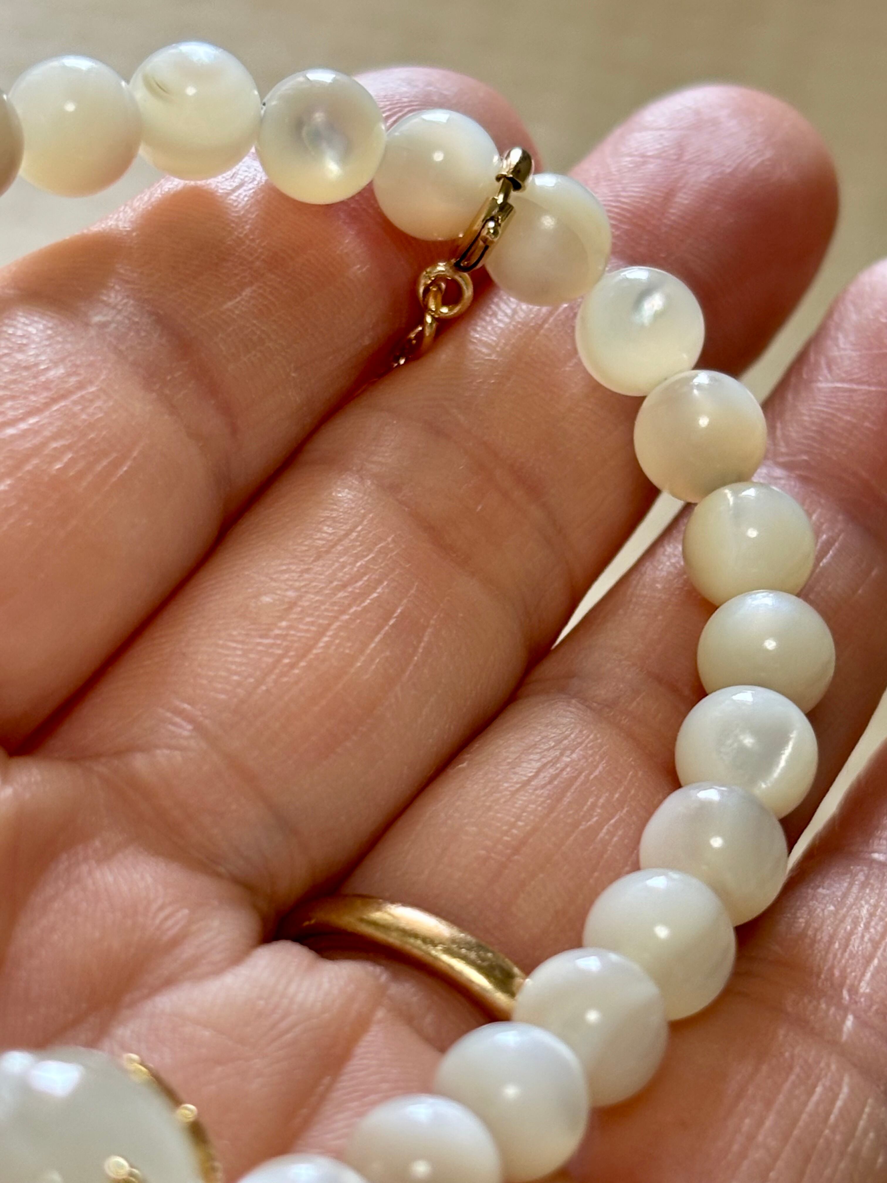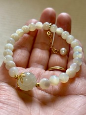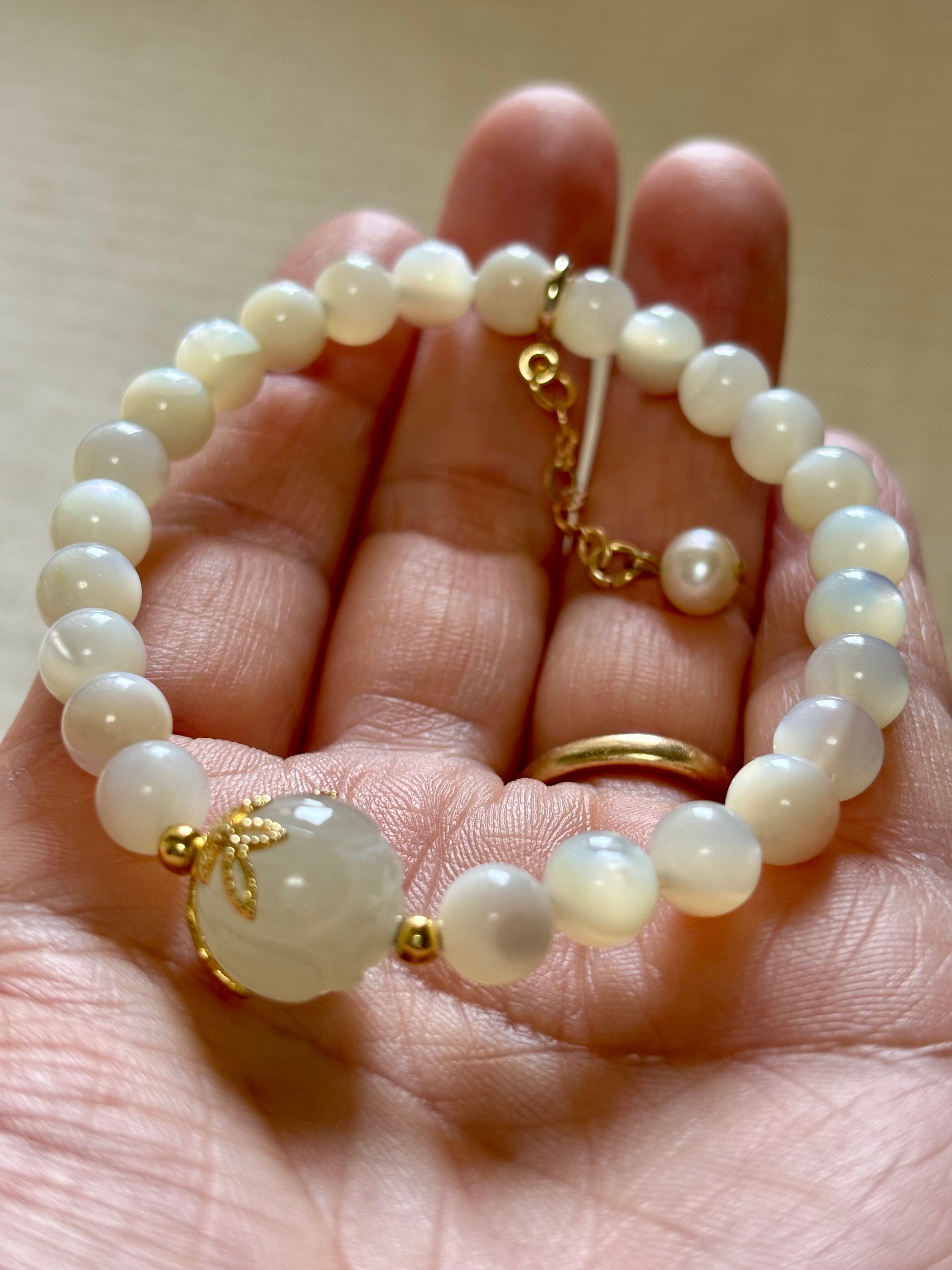 美しいとろみのあるホータン翡翠と、照りが美しいマザーオブパールのブレスレット。