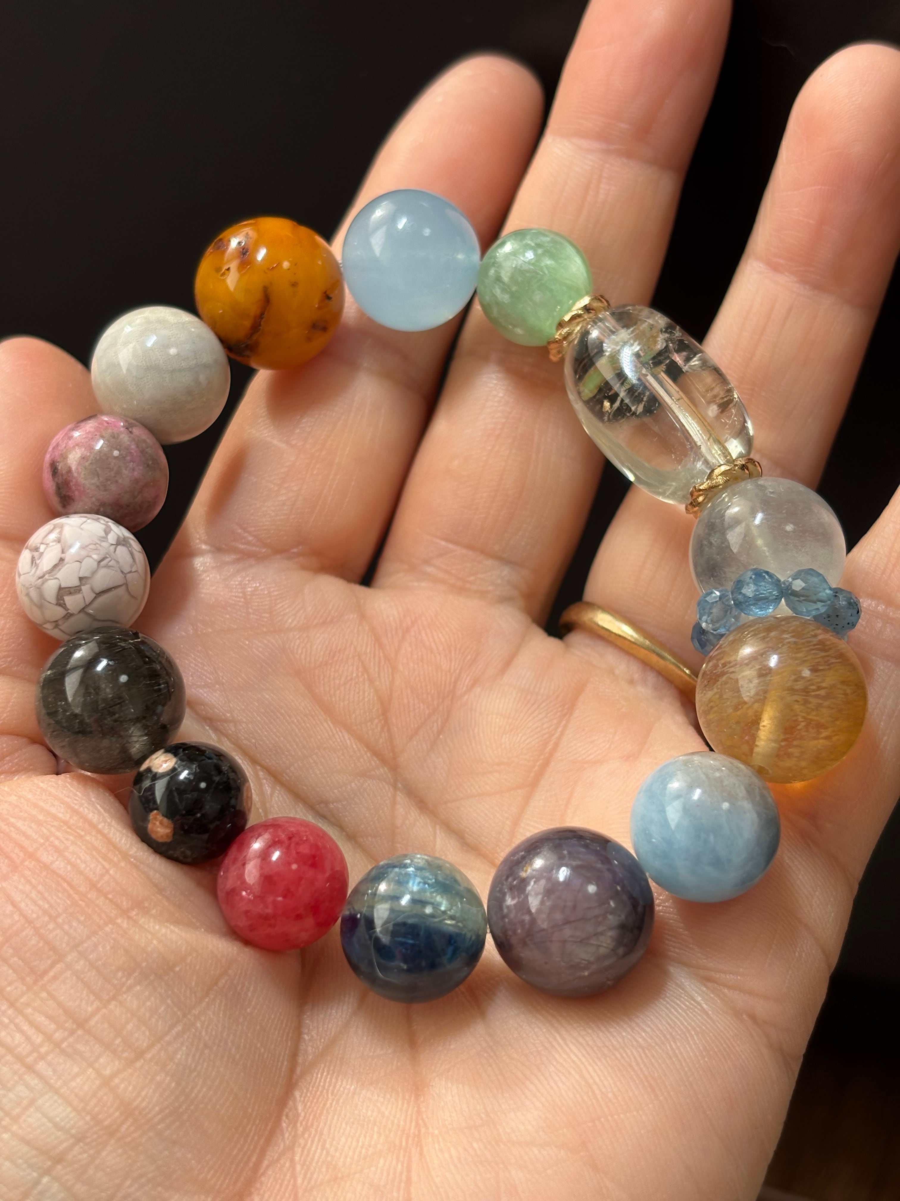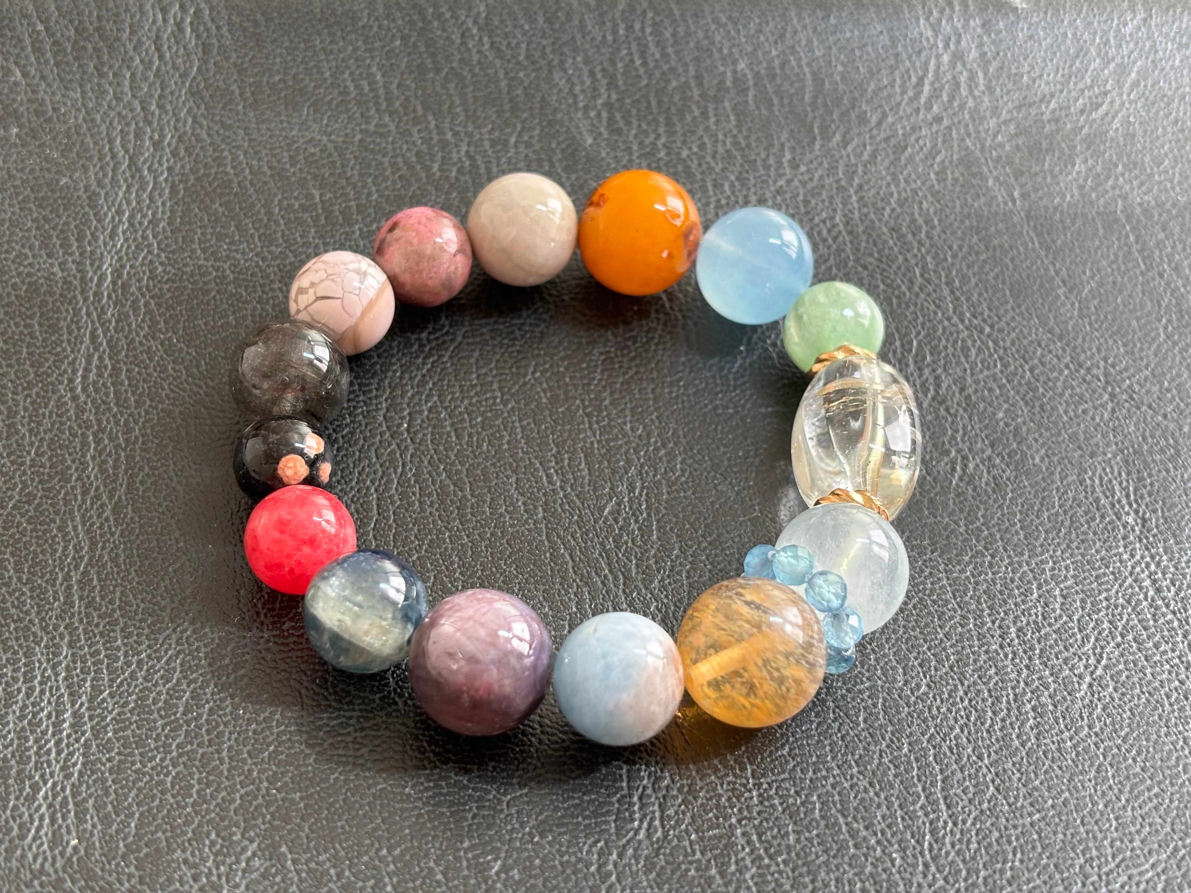 ひとつのブレスレットで、色々な色彩を感じるブレスレットは、重ね付けしても、1本でも