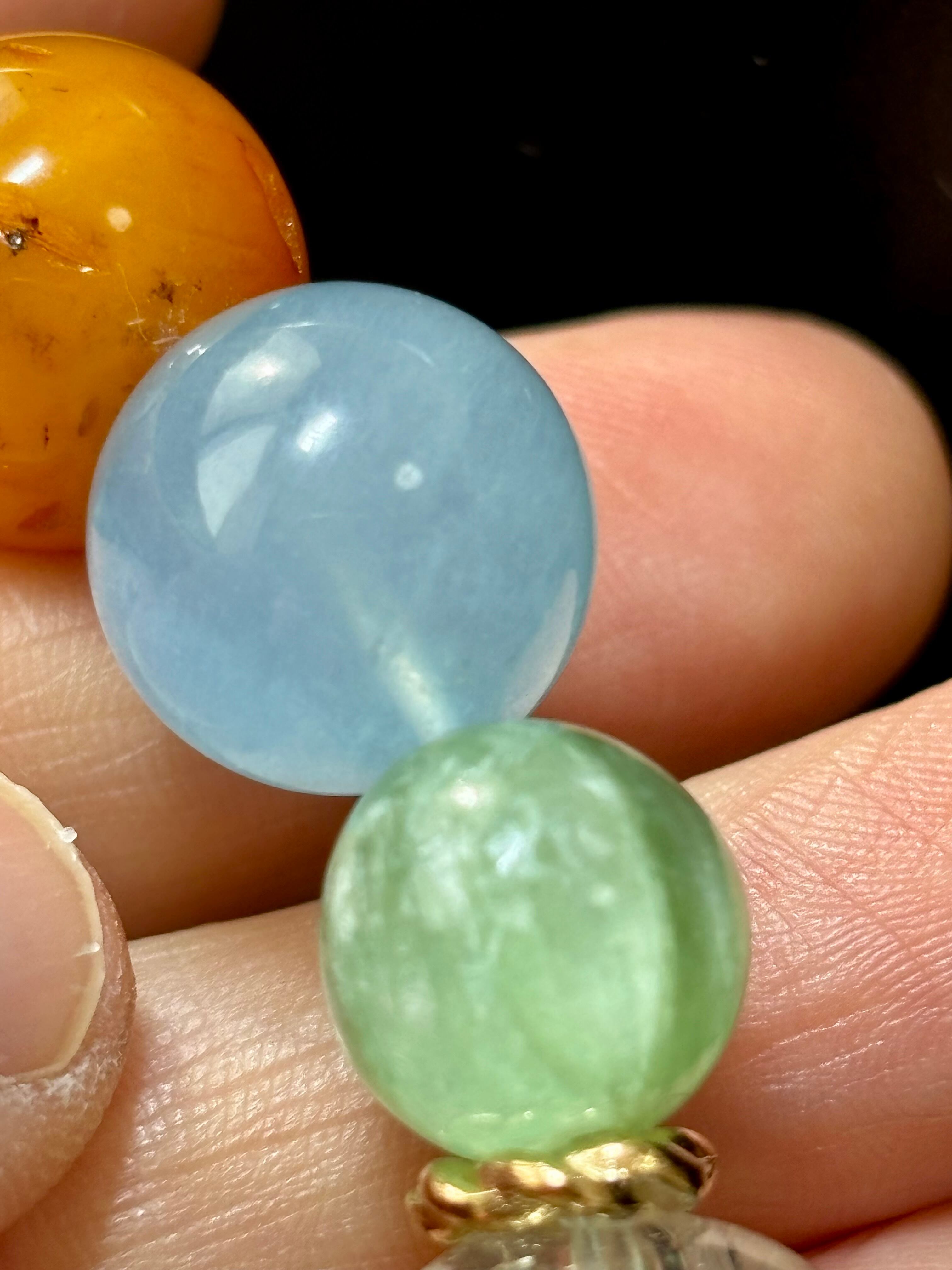 虹の入った美しいグリーンアメジストのタンブルをトップに、さまざまな色を詰め込んだ