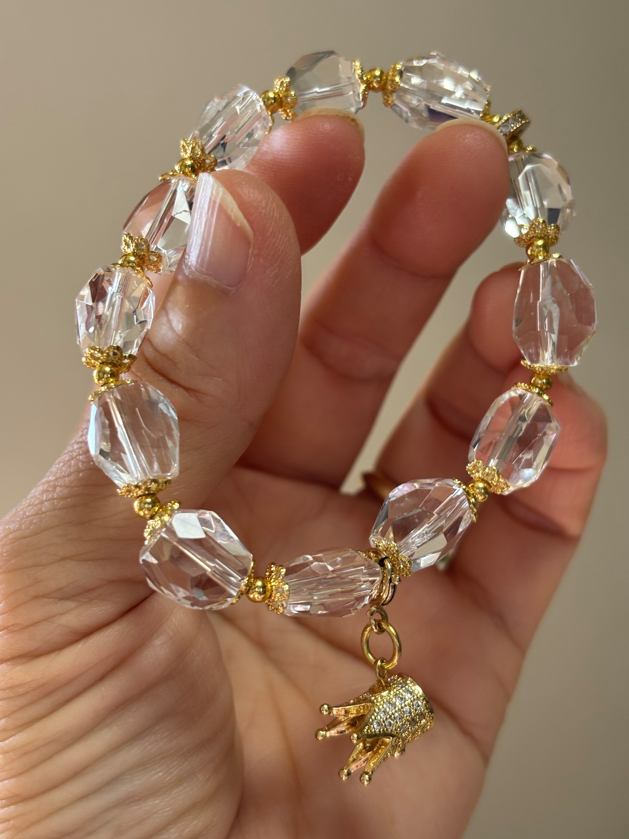 高品質タンブル型キラキラ水晶のデザインブレスレット。ゴールドバージョン。