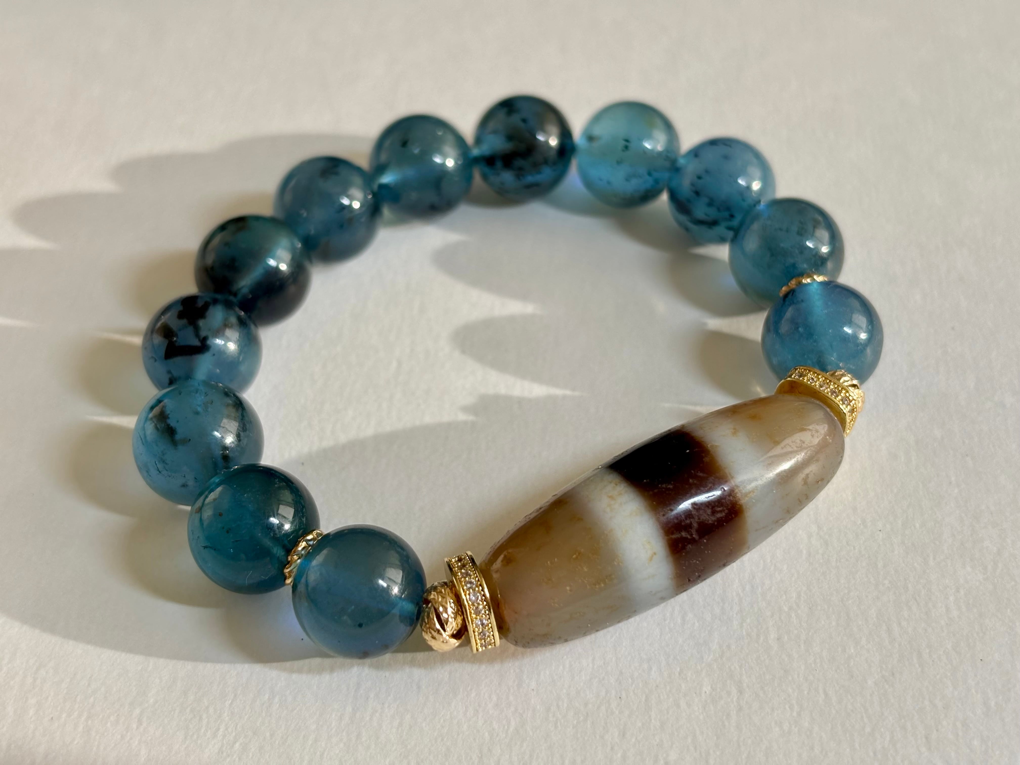 濃くて綺麗なモスアクアマリンと、美しいチベット産古瑪瑙の三線天珠のデザインブレスレット。