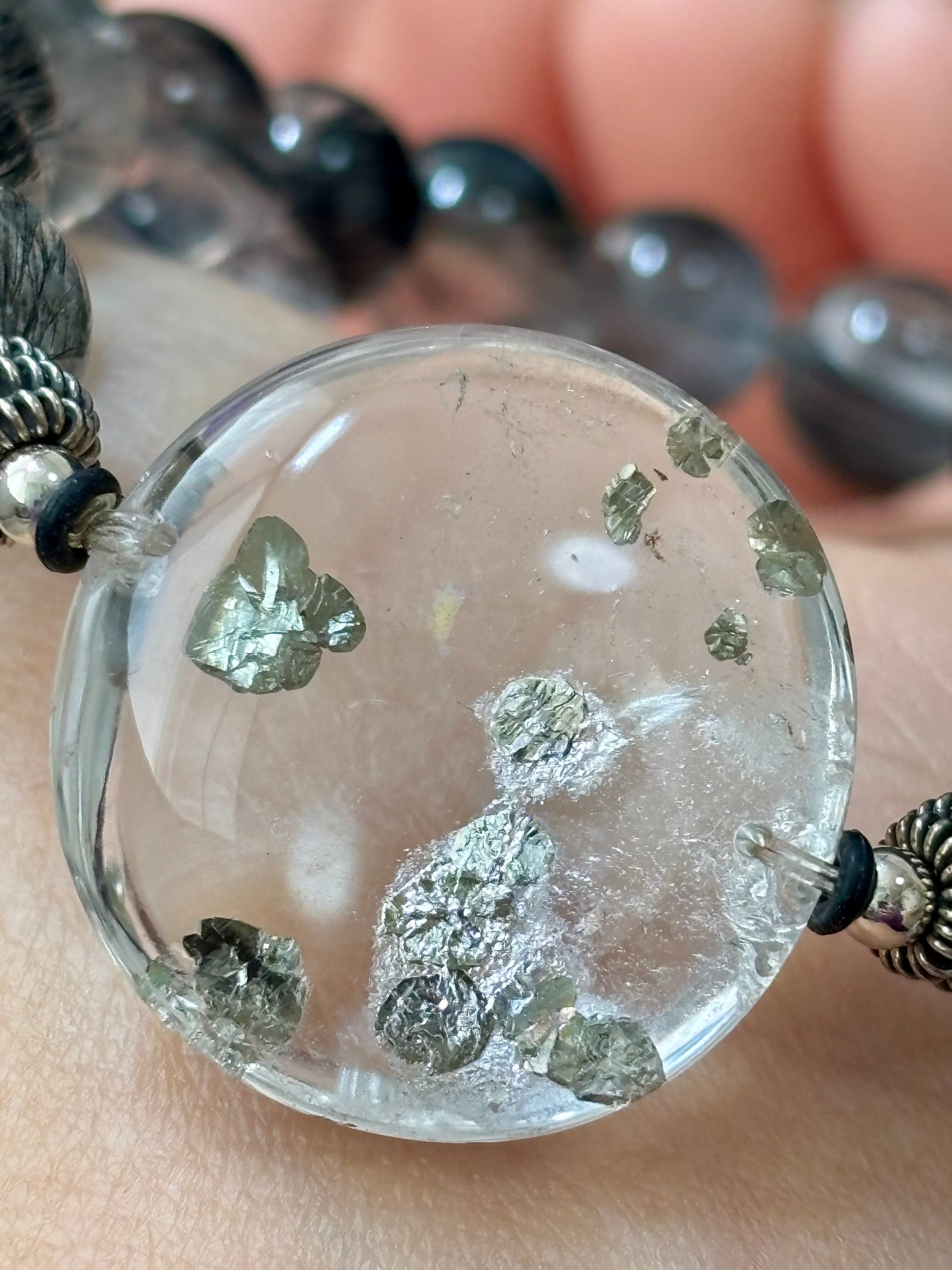 パイライトインクォーツは、インクォーツのなかでも、非常に高価で、丸玉のブレスレットで、すごく小さな内包でも軽く1万円超えていることが多いです。