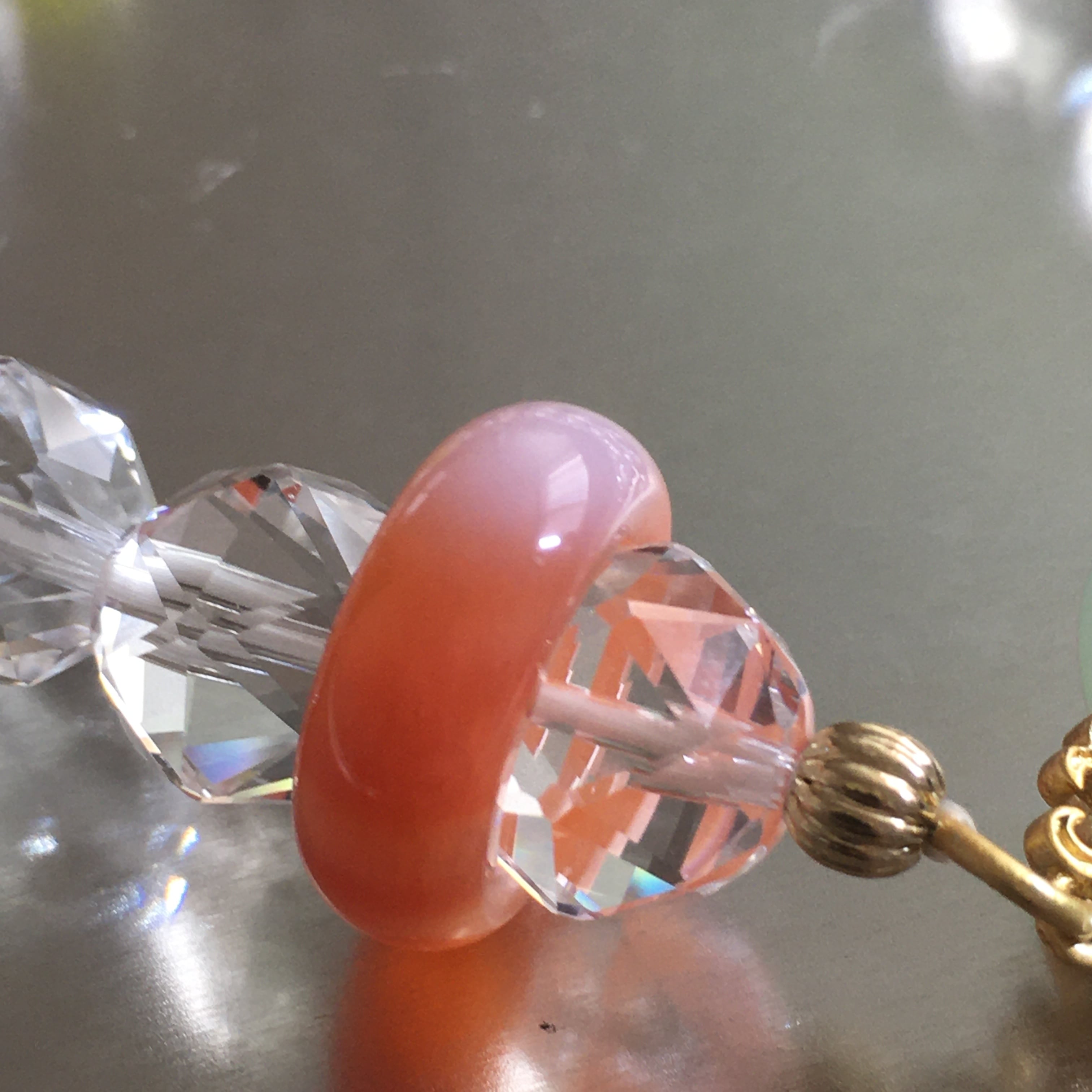 サークルをトップにスターカット水晶、オレンジホワイトのグラデーションの翡翠のサークルに、キャッツアイの出るゴールデンプレナイトを入れたデザインブレスレット。