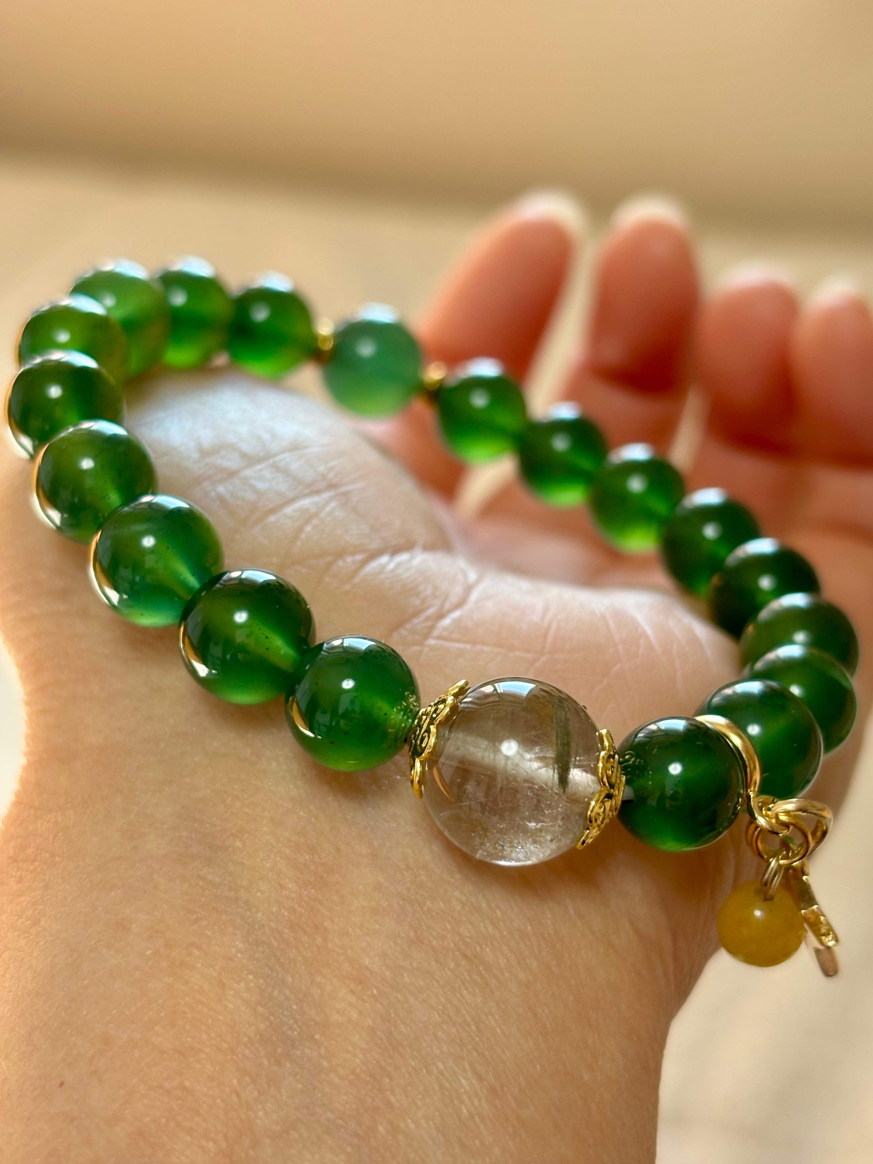 美しいネフライトと、グリーンルチルのブレスレット。