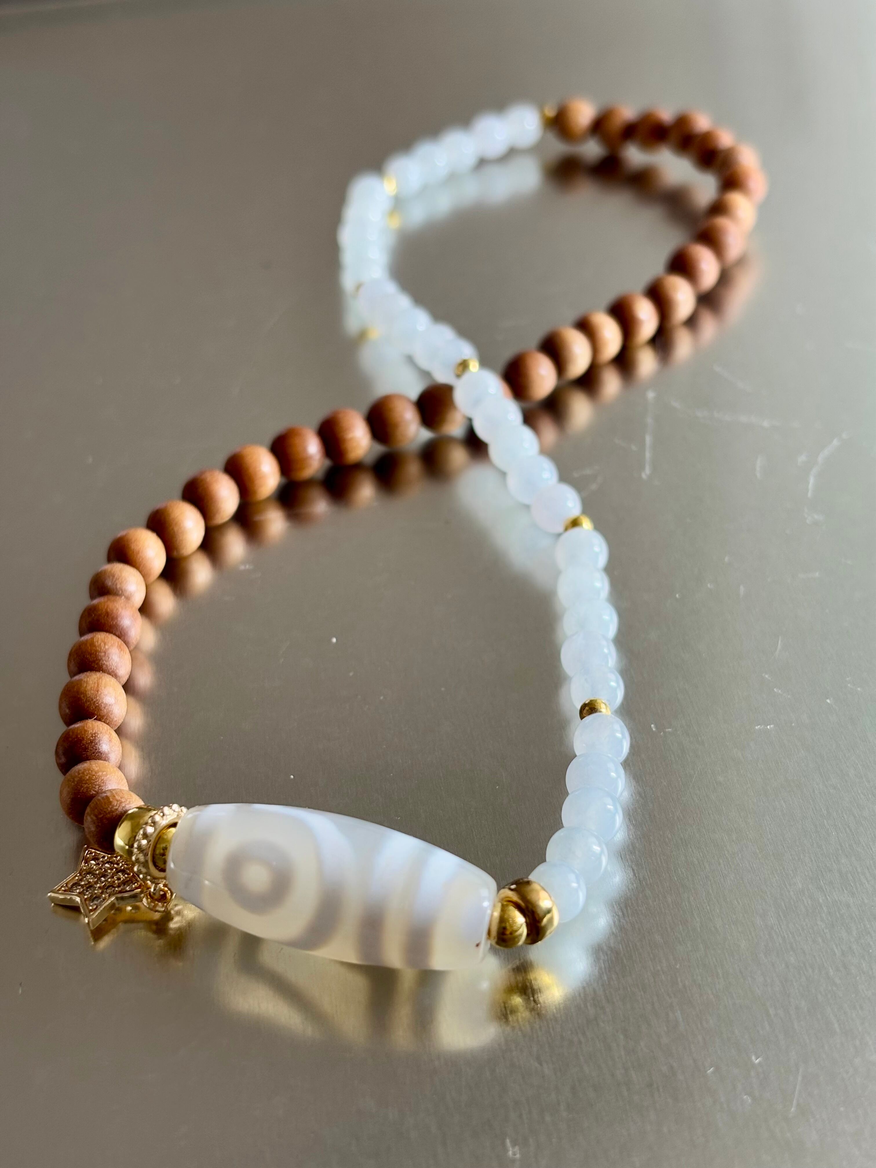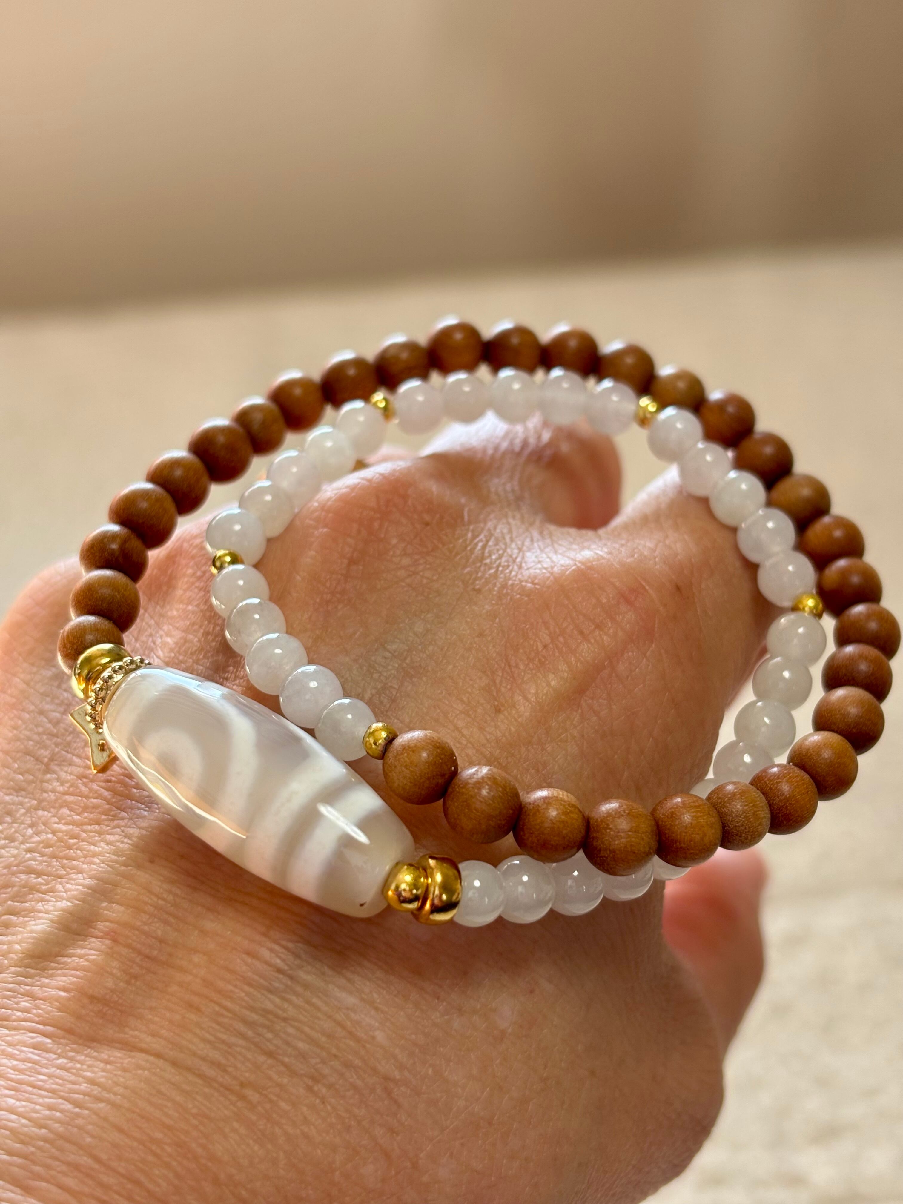 透け感のある、二眼天珠と、ほんのり良い香りの白檀の2連ブレスレット。